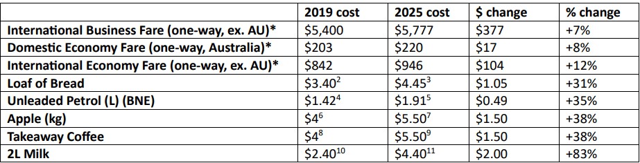 According to reported pricing, a 2-litre carton of milk (+83 per cent), take away coffee (+38 per cent), 1kg bag of apples (+38 per cent), unleaded petrol (+35 per cent), and a loaf of bread (+31 per cent), rose at a far higher rate than the cost of both domestic (+8 per cent) and international (+7-12 per cent) airfares between 2019 and 2025.
