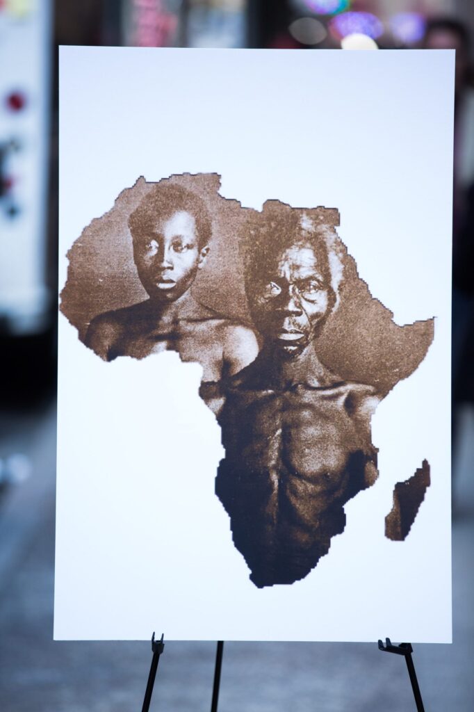 NEW YORK, NY – MARCH 20: A sample image of “Papa” Rnety and his daughter Delia, taken in 1850, during a press conference announcing a lawsuit against Harvard University on March 20, 2019 in New York City. Tamara Lanier has accused Harvard University of the wrongful seizure, possession and monetization of photographic images of her great-great-great grandfather, an enslaved African man named Renty, and his daughter, Delia. (Photo by Kevin Hagen/Getty Images)