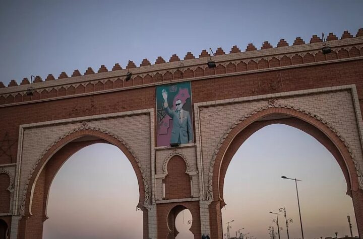 An archway in the entrance of Dakhla carries an image of Morocco’s King Mohammed...