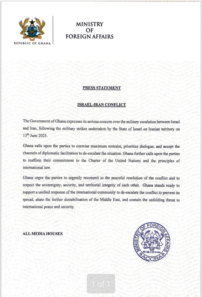 Reaffirming its support for multilateral diplomacy, Ghana declared its readiness to back a unified response from the international community to curb the violence, prevent its spread, and contain further destabilization in the Middle East. The Ministry warned that continued escalation poses a significant threat to regional and global peace and security.