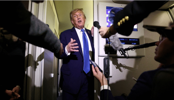 President Donald Trump speaks to reporters aboard Air Force One after departing early from...