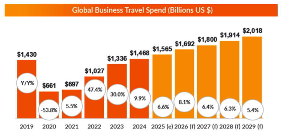 Despite near-term challenges, global spending is projected to surpass $2 trillion by 2029 ─ one year later than anticipated a year ago ─ driven by structural shifts in trade, investment, and corporate travel behavior.
