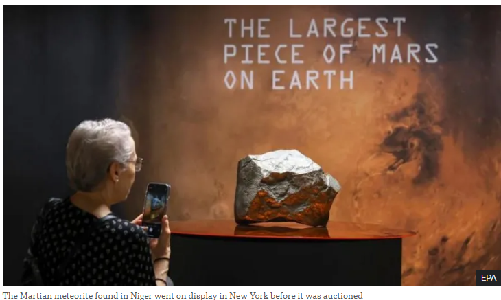 This millions-of-years-old piece of the Red Planet, the largest ever found on Earth, fetched $4.3m (£3.2m) at Sotheby’s. Like the buyer, the seller was kept anonymous.