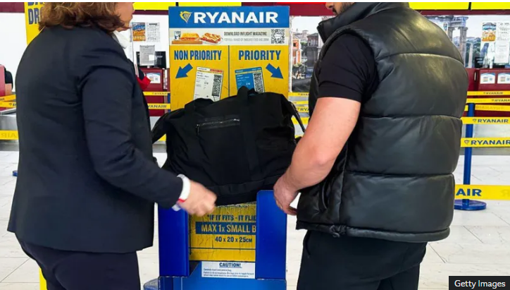 Ryanair passengers are allowed a free bag to take on board, but can be charged up to £75 they try to bring a larger bag than allowed onto a flight, depending on the route and travel date.