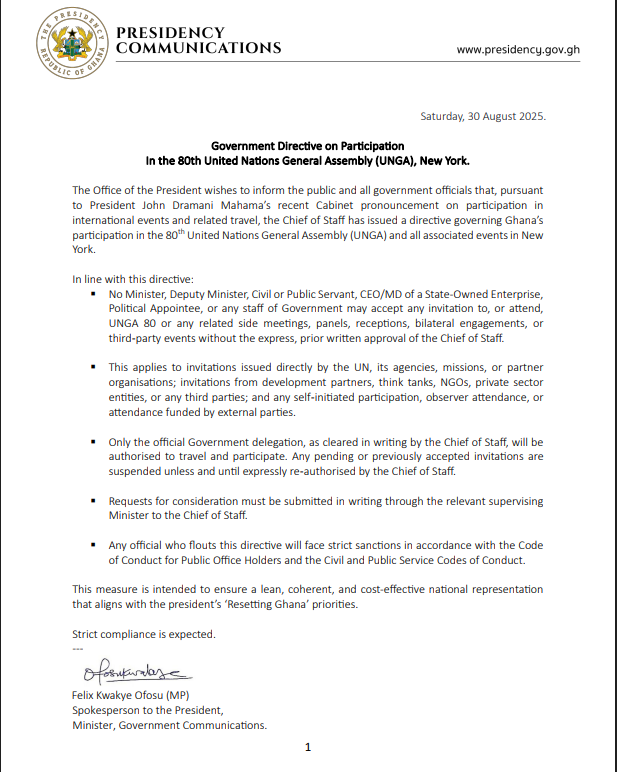The directive is in line with a recent Cabinet pronouncement by President John Dramani Mahama on international travel and participation in global events. The Chief of Staff emphasised that only those officially cleared by the government will be allowed to represent Ghana at the UNGA and its associated meetings, panels, receptions, and bilateral engagements.