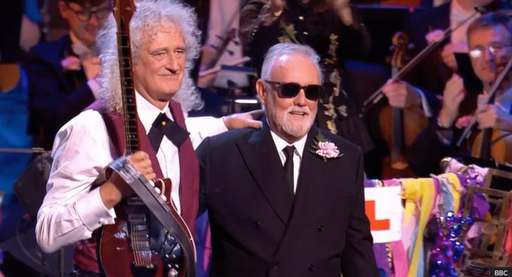 Sir Brian momentarily missed his cue on the closing guitar solo but the climax – a ghostly recording of Mercury singing “any way the wind blows” followed by Roger Taylor striking Britain’s largest gong – was met with a massive roar of approval.