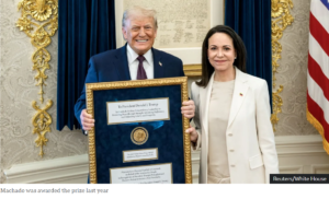 Venezuelan Nobel Peace Prize winner presents her medal to Trump