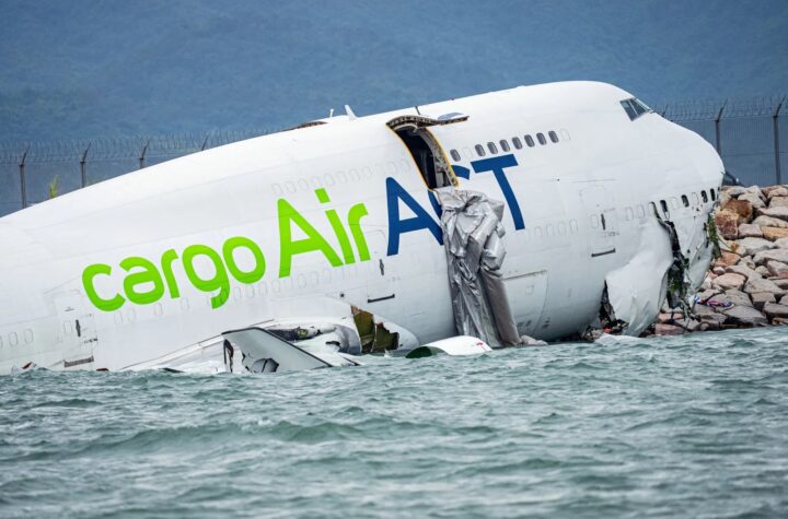 A cargo plane skidded off a runway at Hong Kong International Airport and landed...