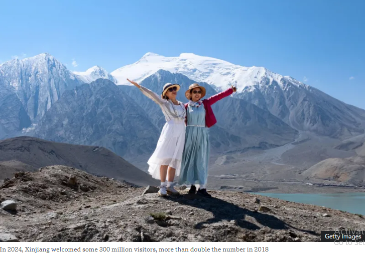 In 2024, the region welcomed some 300 million visitors, more than double the number in 2018, according to Chinese authorities. Tourism revenue from Xinjiang grew about 40% over this period to reach 360 billion yuan ($51bn; £39bn). In the first half of this year, some 130 million tourists visited the region, contributing about 143bn yuan in revenue.