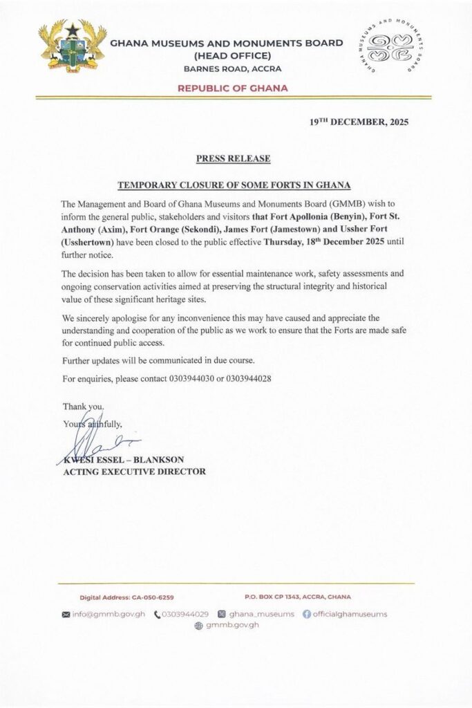 In a statement issued on Friday, December 19, 2025, the Board said the affected sites are Fort Apollonia at Beyin, Fort St. Anthony in Axim, Fort Orange in Sekondi, James Fort in Jamestown, and Ussher Fort at Usshertown. The closures took effect from Thursday, December 18, 2025.
