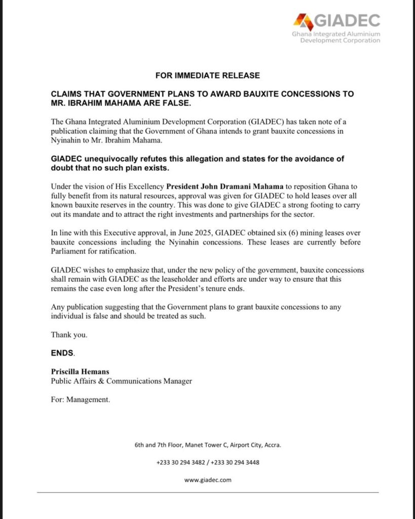 The statement further disclosed that in June 2025, GIADEC obtained six mining leases covering bauxite concessions, including those at Nyinahin, in line with the executive approval. These leases, the corporation noted, are currently before Parliament for ratification.