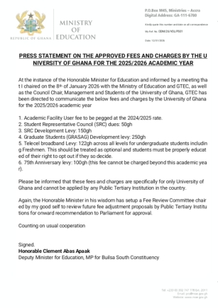In a press statement dated January 12, 2026 issued by the Ministry of Education, the Deputy Minister of Education, Dr Clement Apaak explained that he chaired a meeting on January 8, 2026 with the Ministry of Education and GTEC, as well as the Council Chair, Management and Students of the University of Ghana, where GTEC directed to communicate the below fees and charges by the University of Ghana for the 2025/2026 academic year,